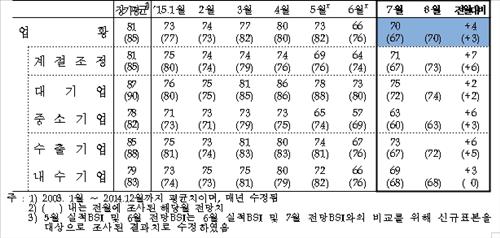 하지만 7월 업황 BSI는 메르스 타격이 발생하기 전인 4월(80)이나 5월(73)보다는 낮은 수준이어서 메르스의 충격을 아직 완전히 극복하진 못한 것으로 분석됐다.