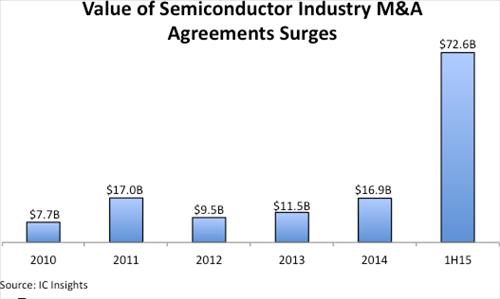 31일 시장조사기관 IC인사이츠의 맥클린 보고서에 따르면 올해 상반기 반도체 산업의 M&A 활동에 의한 합병가치는 726억달러(약 85조원)에 이르는 것으로 집계됐다.