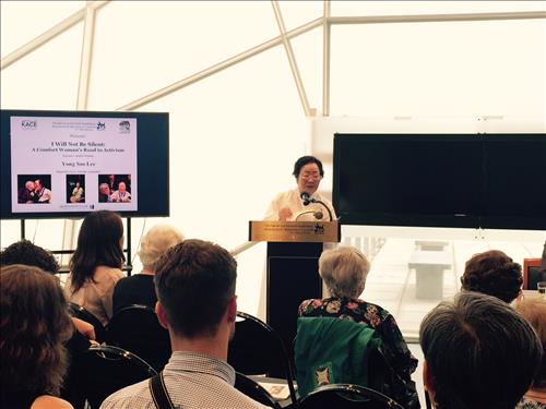 이 자리에서 위안부 피해자로 뉴욕을 방문 중인 이용수(87) 할머니는 "이런 일이 다시는 일어나지 않게 하기 위해 앞으로 열심히 활동하는 활동가가 될 것"이라며 행사에 참석한 학생들에게 "우리가 아무리 부족하고 힘이 없더라도, 학생들이 노력해 두 번 다시 이런 일이 없는 나라을 만들어가기를 부탁한다"고 말했다.