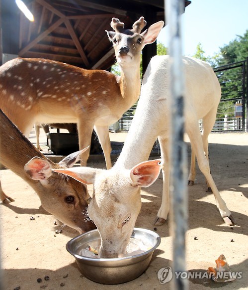 | △ 폭염엔 얼음과일이 최고 (울산=연합뉴스) 이상현 기자 = 울산지역에 닷새째 폭염경보가 발령된 31일 울산대공원 동물원의 꽃사슴 가족이 얼음과일을 먹고 있다. 오른쪽 하얀색 동물은 다마사슴. 2015.7.31 leeyoo@yna.co.kr |