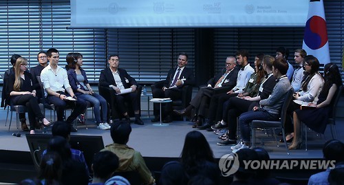 | △ 한-독 대학생 한반도 통일 토론회 (베를린=연합뉴스) 김도훈 기자 = 31일(현지시간) 독일 베를린 알리안츠 포럼 열린 한-독 대학생 한반도 통일 토론회가 진행되고 있다. 이날 행사에는 유라시아 친선특급 참가 대학생 및 독일 대학생들이 한 자리에 모여 독일 과 한반도 통일에 대한 의견을 나누었다. |