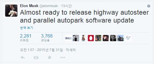 머스크는 이날 트위터를 통해 고속도로 자율주행과 자동 평행주차 기능을 지닌소프트웨어 업데이트를 내놓을 준비가 거의 됐다고 말했다.