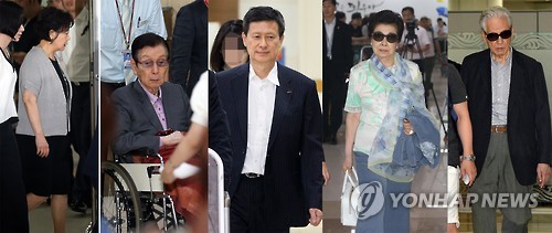 | △ 왼쪽부터 신영자 롯데장학재단 이사장, 신격호 총괄회장, 신동주 전 일본롯데 부회장, 시게미쓰 하쓰코(重光初子) 신 총괄회장 부인, 신선호 일본 산사스 사장. << 연합뉴스 DB >> |