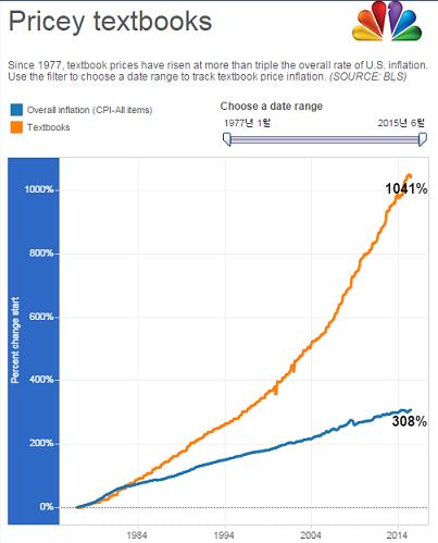 미국 NBC방송은 미 노동부 통계를 자체 분석한 결과 1977년부터 지난 6월까지 소비자물가지수가 308% 오른 반면, 대학 교과서 값은 1,041% 상승했다고 보도했다.