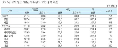 월보수는 공립 유치원 교사가 336만4천원으로, 사립 유치원 교사의 207만5천원보다 118만9천원 많았다. 어린이집 중에서는 국공립 어린이집 교사가 214만4천원으로, 민간 어린이집 159만8천원, 가정 어린이집 142만5천원과 큰 차이가 났다.