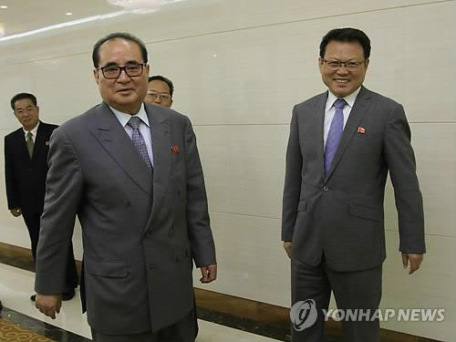 | △ (평양 AP=연합뉴스) 리수용 북한 외무상(왼쪽)이 3일 평양 공항에서 박명국 외무부상(오른쪽)의 전송을 받고 있다. 리 외무상은 말레이시아에서 열리는 아세안 지역안보포럼(ARF)에 참석한다. |
