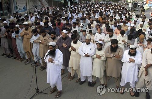 △ 탈레반 지도자인 물라 무하마드 오마르를 지지하는 파키스탄 종교단체 '자마투드 다와'가 2일 파키스탄 카라치의 사원 밖에서 오마르의 사망을 추모하는 기도를 하고 있다.(AP=연합뉴스)