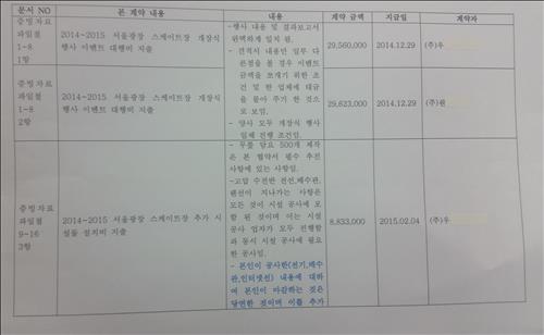 또 제빙업체에는 계약대로 3억 2천500만원만 지급됐지만 이벤트업체에는 계약금보다 약 3억원이 많은 7억원이 지급됐다. 집행 내용에는 제빙업체에도 계약금보다 많은 사업비가 지급됐다고 표시됐다.