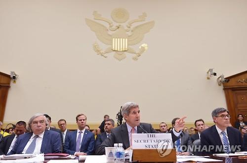 | △ 의회 청문회에 출석한 존 케리 국무장관(가운데)과 어니스트 모니스 에너지 장관(왼쪽), 제이콥 루 재무장관(오른쪽) (AFP=연합뉴스) |