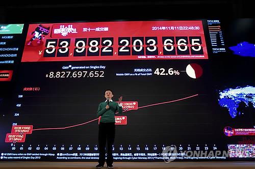| △ (항저우 AP=연합뉴스) 마윈 알리바바그룹 회장이 지난해 11월11일 '독신자의 날' 할인판매 행사후 당일 달성한 매출 기록을 발표하고 있다. |
