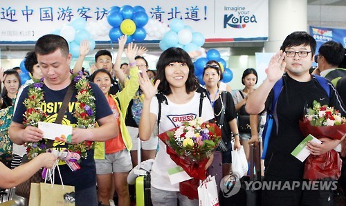 | △ 청주 공항 들어서는 중국인 관광객들 (청주=연합뉴스) 이승민 기자 = 30일 오후 청주공항에서 유커(遊客·중국인 관광객)들이 충북도관계자들의 환영을 받으며 들어서고 있다. 이날 중동호흡기증후군(메르스) 사태로 2개월 가까이 발길을 끊었던 유커들의 청주공항 입국이 재개됐다. 2015.7.30 vodcast@yna.co.kr |