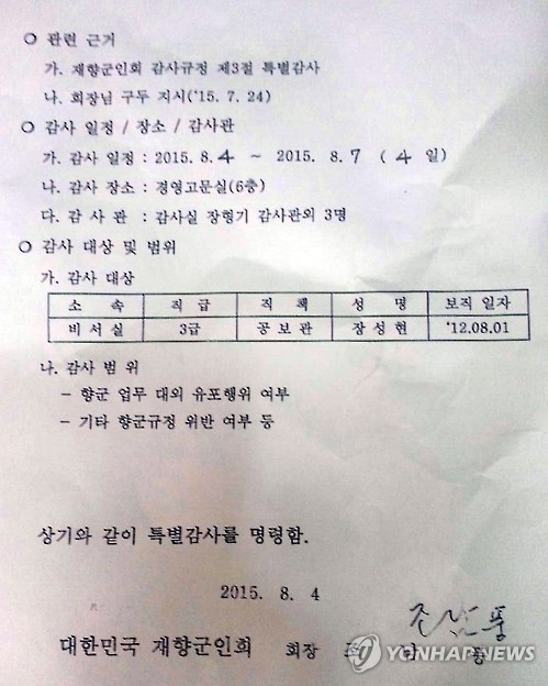조 회장이 서명한 특별감사 명령서에는 장 위원장에 대해 ▲향군 업무 대외 유포행위 여부 ▲향군규정 위반 여부 등을 감사할 것을 요구하고 있다.
