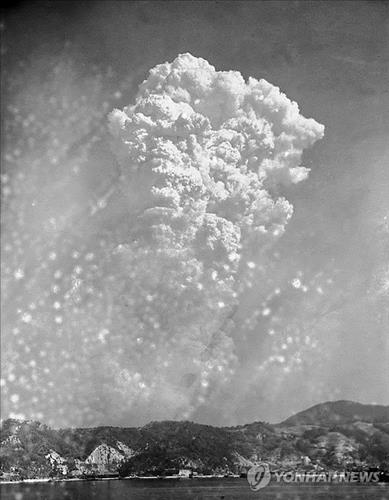 | △ 히로시마 원폭 '구름' 연기 (AP=연합뉴스) 미국은 1945년 8월 두 개의 원자폭탄을 일본 히로시마와 나가사키에 각각 투하했다. 이는 사상 최초이자 유일하게 핵무기가 전쟁에서 쓰인 사건이었으며, 일본은 그 해 8월 15일 무조건 항복을 선언했다. 사진은 1945년 8월 6일 원자폭탄이 히로시마에 투하된 직후 구름 모양의 거대한 연기가 약 6천100m(2만 피트) 상공으로 치솟는 모습. |