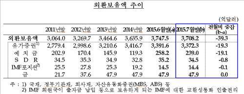 5일 한국은행에 따르면 7월 말 현재 우리나라의 외환보유액은 3천708억2천만 달러로 6월 말보다 39억3천만 달러 줄었다.