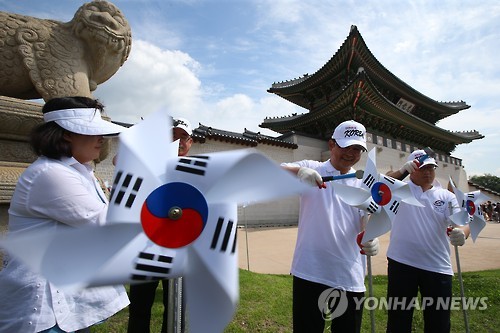 | △ 광복 70주년 맞아 등장한 바람개비 태극기 (서울=연합뉴스) 김도훈 기자 = 광복 70주년을 열흘 앞둔 5일 오전 서울 광화문 앞에서 행정자치부 정재근 차관을 비롯한 직원들이 태극기 문양의 바람개비를 설치하고 있다. |