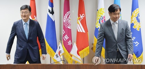| △ 각자 자리로 향하는 한·일 국방정책 실무회의 수석대표 (서울=연합뉴스) 임헌정 기자 = 윤순구 국방부 국제정책관(왼쪽)과 스즈키 아츠오(鈴木敦夫) 일본 방위성 방위정책차장이 5일 서울 용산 국방부에서 열린 한·일 국방정책 실무회의에 앞서 악수한 뒤 각자 자리로 향하고 있다. 한·일 국방정책 실무회의는 1994년부터 한국 국방부와 일본 방위성의 국장급 인사가 대표로 참가하는 정례회의체이다. 매년 교대로 상대국을 방문해 개최했으나 지난해에는 과거사 문제에 대한 일본 측의 불성실한 태도로 열리지 않았다. |