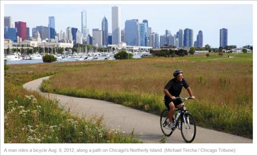 | △ 시카고 도심 고층빌딩 숲을 배경으로 미시간호변에 조성된 노덜리 섬 (시카고 트리뷴 웹페이지 캡처) |