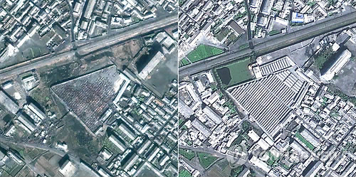 | △ 북한 장마당 몇년 새 급속 확장 (서울=연합뉴스) 미국의 자유아시아방송은 13일 북한의 강원도와 황해도 등에 위치한 북한 지역의 장마당이 최근 몇 년 사이 크게 확장된 것으로 보이는 구글어스 위성사진을 소개했다. 사진은 북한 강원도 원산시 장마당의 2002년(왼쪽)과 2009년의 달라진 모습 원산시에서 가장 큰 규모인 이 장마당을 2002년 당시의 위성사진과 비교해 보면 7년 사이 곳곳에 건물이 빼곡히 들어서고 도로가 정비돼 있는 등 복잡한 도시로 변신해 있다. 2011.4.13 <<사진=자유아시아방송(RFA) 제공>> |