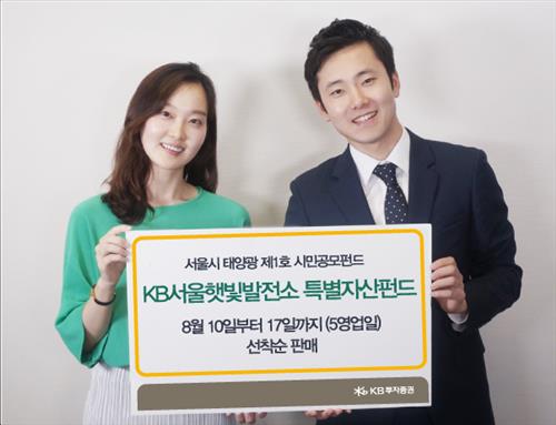 (서울=연합뉴스) 국기헌 기자 = KB투자증권은 오는 10일부터 17일까지 서울시 태양광 제1호 시민공모펀드인 'KB서울햇빛발전소 특별자산펀드' 82억5천만원어치를 선착순으로 판매한다고 6일 밝혔다.