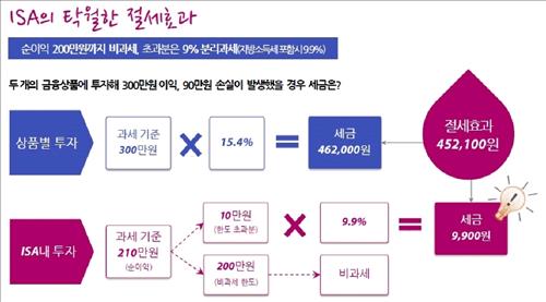 ISA의 가장 큰 장점은 세제 혜택이다. 3∼5년 동안 계좌 내 모든 상품의 이익과 손실을 합산한 순수익에서 200만원까지는 세금을 물리지 않는다. 200만원을 초과하는 수익에 대해서는 9% 분리과세(지방소득세 포함시 9.9%)된다.