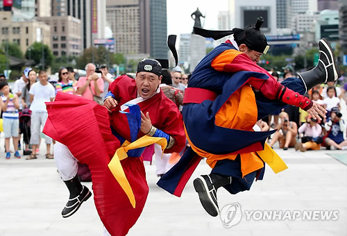 △ 한산대첩 축제 홍보, 24반 무예 (서울=연합뉴스) 홍해인 기자 = 2일 오후 서울 세종대로 광화문광장에서 '제53회 통영한산대첩 축제'를 홍보하기 위한 '미리 보는 축제'에 참가한 행사 참가자들이 스물네가지 기예로 구성된 24반 무예 시범을 보이고 있다. 충무공 이순신 장군의 한산대첩 승리를 기리는 통영한산대첩축제는 오는 13일부터 17일까지 경남 통영시 일대에서 개최된다. 2014.8.2 hihong@yna.co.kr