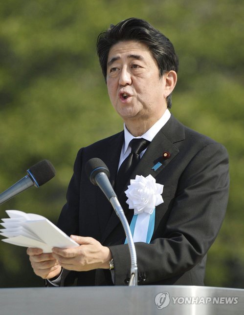 | △ 히로시마 원폭 70주년 추도사 낭독하는 아베 (히로시마 AP=연합뉴스) 6일(현지시간) 일본 히로시마 평화기념공원에서 열린 히로시마 원폭 투하 70주년 추도식에서 아베 신조 일본 총리가 추도사를 낭독하고 있다. |