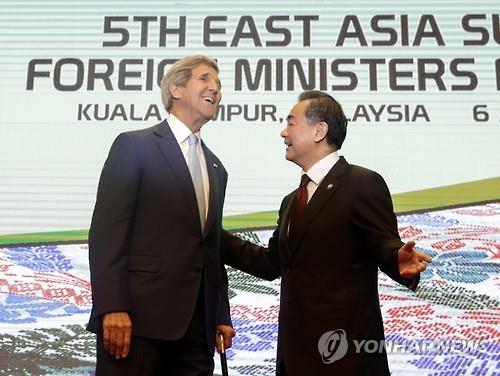 | △ '웃고는 있지만...' 지난 5일 말레이시아 쿠알라룸푸르에서 열린 EAS(동아시아정상회의) 외교장관회의에서 만난 존 케리 미국 국무장관과 왕이 중국 외교부장이 이야기를 나누고 있다.(EPA=연합뉴스DB) |