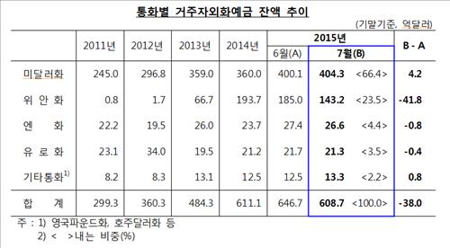 한국은행이 7일 발표한 '7월 말 거주자 외화예금 현황'을 보면 거주자 외화예금 잔액은 지난달 말 현재 608억7천만 달러로 한 달 전보다 38억 달러 줄었다.