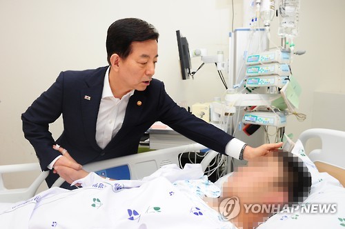 | △ 한민구 장관, DMZ 폭발사고로 다쳐 치료받는 부사관 위문 (서울=연합뉴스) 한민구 국방부 장관이 7일 경기도 성남시 분당서울대학교병원을 방문, 지난 4일 경기도 파주 인근 DMZ에서 수색작전 중 폭발물이 터져 부상한 하모 하사를 위문하고 있다. (국방부 제공) |