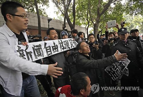 △ 시진핑(習近平) 국가주석을 중심으로 한 중국 지도부의 검열 강화로 정권에 비판적인 지식인들, 특히 자유주의 성향의 학자들이 설 자리를 잃고 있다고 6일(현지시간) 영국 가디언이 보도했다. 사진은 시 주석 집권 초기인 지난 2013년 1월 광둥성의 진보 주간지 남방주말(南方周末) 사옥 밖에서 진보파 인사들이 언론자유와 검열철폐를 요구하는 시위를 벌이며 경찰과 대치하는 모습. 2015.8.7 (AP=연합뉴스DB)