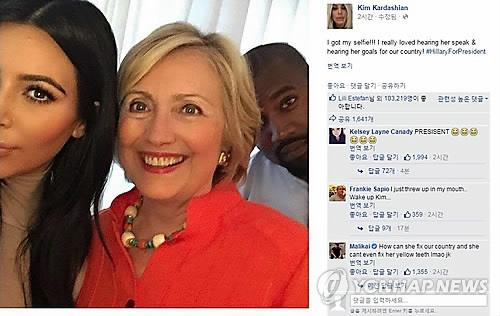 카다시안은 클린턴 전 장관과의 사진을 페이스북에 올리며 "(클린턴과) 셀카를 찍었다! 클린턴의 연설을 듣고 그가 우리나라의 목표에 대해 말하는 것을 듣는 것이너무 좋다"고 기쁨을 나타냈다.
