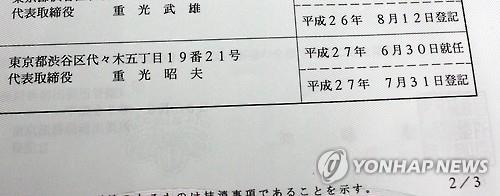 | △ 주식회사 L투자회사의 등기부등본 대표이사 란에 신동빈 회장의 일본 이름인 '시게미쓰 아키오'(重光昭夫)가 표기돼 있다. |