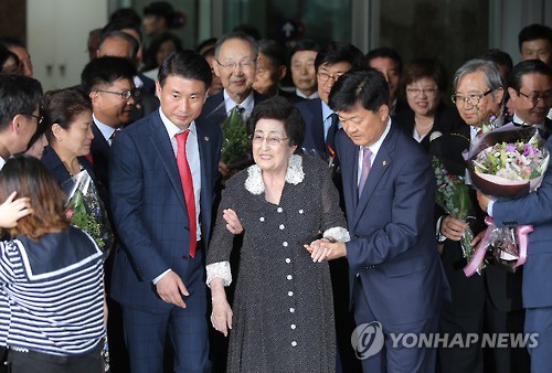 △ 방북 마친 이희호 여사 (서울=연합뉴스) 이정훈 기자 = 3박 4일간의 방북 일정을 마친 이희호 여사가 8일 오후 김포공항을 통해 귀국하고 있다.