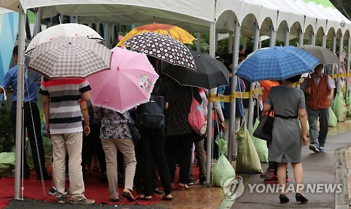 | △ 지난 6월 30일 오전 대구시 달서구 대곡동의 한 아파트 청약접수 현장에 비가 내리는 가운데 인파가 몰리고 있다. (연합뉴스 자료사진) |
