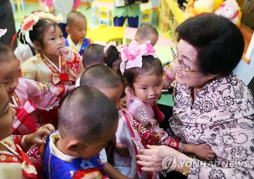 | △ 이희호 여사, 육아원 방문 (서울=연합뉴스) 3박 4일간의 일정으로 북한을 방문한 이희호 여사가 6일 평양의 한 육아원을 방문해 어린이들을 안아주고 있다. 북한에서 육아원은 유치원 취학 전의 고아를, 애육원은 유치원 나이의 고아를 돌보는 곳이다. 2015.8.8 << 김대중평화센터 제공 >> photo@yna.co.kr |