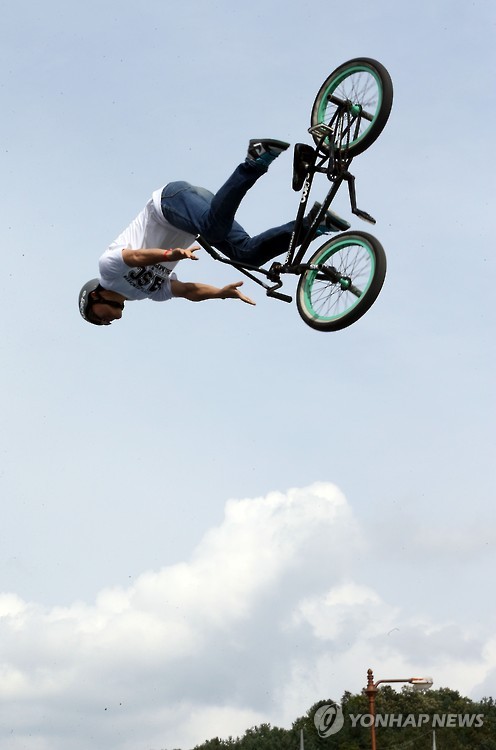 △ 춘천레저대회 멋진 기술 (춘천=연합뉴스) 이상학 기자 = 9일 강원 춘천시 송암레포츠타운에서 '2015 춘천레저대회'가 열려 액션스포츠 종목에 출전한 선수가 화려한 기술을 선보이고 있다. 2015.8.9 hak@yna.co.kr