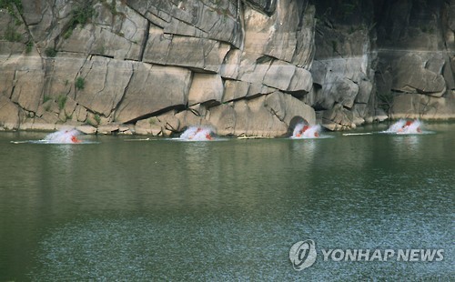 | △ 대청호에 설치된 녹조 방지용 수차 (옥천=연합뉴스) 박병기 기자 = 10일 충북 옥천군 군북면 추소리 바위절벽 앞 대청호에 녹조확산을 막기 위해 설치해 놓은 수차가 돌고 있다. 대청댐관리단은 이 지역의 조류 수치가 '경보' 발령 기준을 넘어섰다고 밝혔다.2015.8.10 bgipark@yna.co.kr |