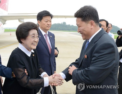 △ 김대중 전 대통령의 부인 이희호 여사가 5일 오전 북한 평양 순안국제공항에 도착해 맹경일 조선아시아태평양평화위원회 부위원장의 영접을 받고 있다.