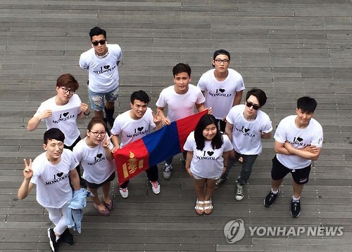 △ 'I♥MONGOLIA' 모국에 기부한 광운대 몽골 유학생들 (서울=연합뉴스) 지난 6월 광운대 몽골학생회는 몽골 울란촐로트 쓰레기마을 아이들에게 농구장을 지어주는 프로젝트에 참여했다. 티셔츠를 구매해 모은 성금을 전달했다. 사진 앞줄 맨 왼쪽이 삼보 볼간타미르. 2015.8.9 << 렛츠코몽 제공 >> photo@yna.co.kr