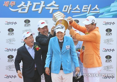 | △ 이정은, 제주 삼다수 마스터스 우승 (제주=연합뉴스) 박지호 기자 = 9일 제주 오라컨트리클럽(파72·6천519야드)에서 열린 제주 삼다수 마스터스(총상금 5억원) 마지막 날 3라운드에서 2언더파 70타를 치며 우승을 차지한 이정은(교촌F&B)이 대회 관계자들로부터 축하받고 있다. 2015.8.9 jihopark@yna.co.kr |