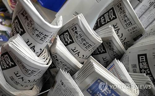 | △ 일본 신문 가판대에 쌓인 니혼게이자이신문(AP.연합뉴스.자료사진) |