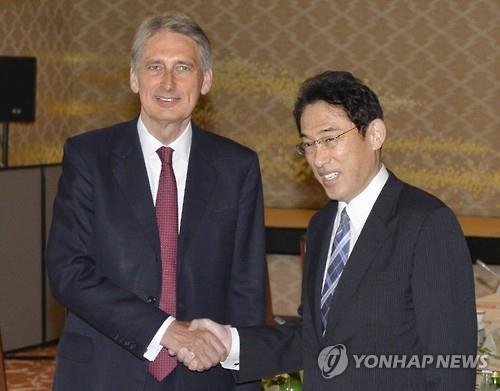 | △ (도쿄 교도=연합뉴스) 기시다 후미오(岸田文雄, 오른쪽) 일본 외무상과 필립 하몬드 영국 외교장관이 8일 일본 도쿄도 소재 외무성 이쿠라(飯倉)공관에서 전략 대화 시작에 앞서 악수하고 있다.2015.8.8 |