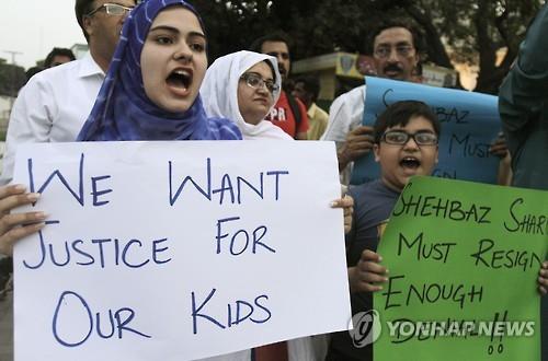 △ 9일 파키스탄 라호르에서 시민단체 회원들이 아동 성범죄자 처벌을 촉구하는 시위를 하고 있다.(AP=연합뉴스)