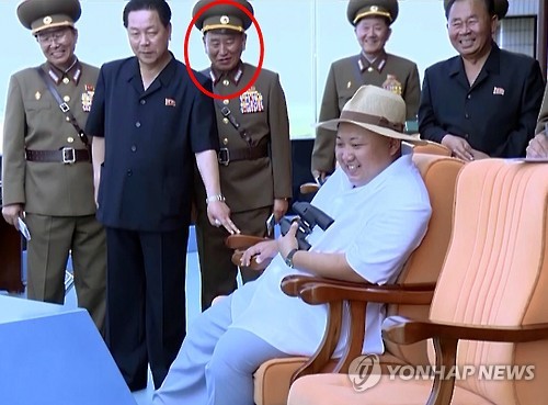 △ '천안함 배후' 북한 김영철 '대장' 승진 (서울=연합뉴스) 천안함 폭침을 주도한 배후로 알려져 온 북한 김영철 정찰총국장(빨간 원)의 계급이 상장에서 대장으로 다시 올라간 것이 11일 북한 매체를 통해 확인됐다. 북한 조선중앙TV에서 이달 1일부터 방영 중인 김정은 국방위원회 제1위원장의 전투비행술경기대회 현지 지도 기록영화를 보면, 김영철 총국장의 군복 견장에 '대장'에 해당하는 '별 네개'가 달려 있는 것이 보인다. 앞서 지난 4월 국가정보원은 김영철의 계급이 기존의 대장에서 상장으로 강등됐다고 밝힌 바 있는데, 그가 대장 계급에 복귀한 것이 이번에 확인된 것이다. 2015.8.11 nkphoto@yna.co.kr