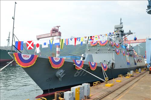육상에서 제작된 함정 선체를 처음으로 물에 띄우는 해군의 전통적인 의식인 진수식에는 이범림 해군참모차장, 이병모 STX조선해양 대표이사 등 각계 주요 인사와 조선소 관계자 등이 참석했다.