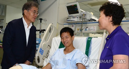 △ 지뢰폭발 부상장병 위문하는 문재인 대표 (성남 국회 사진기자단=연합뉴스) 새정치민주연합 문재인 대표가 11일 오후 경기도 성남시 국군수도병원 중환자실을 찾아 비무장지대(DMZ)내에서 북한이 설치한 것으로 추정되는 목함지뢰 폭발로 부상한 김정원 하사를 위로 방문하고 있다. 2015.8.11 photo@yna.co.kr