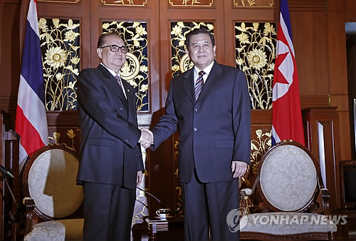 | △ 리수용 북한 외무상(왼쪽)이 10일(현지시각) 태국 방콕을 방문, 따나삭 빠띠마프라곤 태국 외무장관을 만나고 있다. 양측은 이날 오후회담에서 양국 사이의 투자, 농업기술, 관광 등 경제 협력 강화와 친선관계 증진 방안에 대해 의견을 교환했다. |