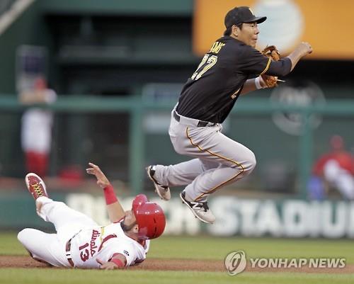△ (세인트루이스 AP=연합뉴스) 피츠버그 파이리츠 한국인 내야수 강정호(오른쪽)가 12일(한국시간) 미국 미주리주 세인트루이스 부시 스타디움에서 열린 세인트루이스 카디널스와 메이저리그 방문 경기에 선발 출전해 유격수 수비를 소화하고 있다. 이날 강정호는 규정타석을 채웠다.