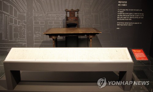 △ 독립투사 부친의 애끓는 고백 (울산=연합뉴스) 허광무 기자 = 고헌 박상진(1884∼1921) 의사의 아버지 박시규옹이 1923년 형무소에서 처형된 아들의 2주기를 맞아 쓴 제문 '제망자상진문(祭亡子尙鎭文)'. 아들에 대한 자랑스러움, 그리움과 원망, 가족이 처한 현실 등이 절절이 담겨 있다. 이 제문은 광복 70주년 기념 특별기획전 '광복, 다시 찾은 빛'이 열리는 울산박물관에 전시돼 있다. 2015.8.13 hkm@yna.co.kr