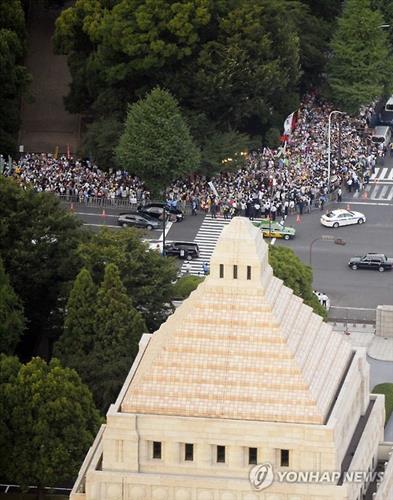 △ 일본 국회의사당과 주변에 모인 안보법안 반대 시위대(교도=연합뉴스 자료사진)